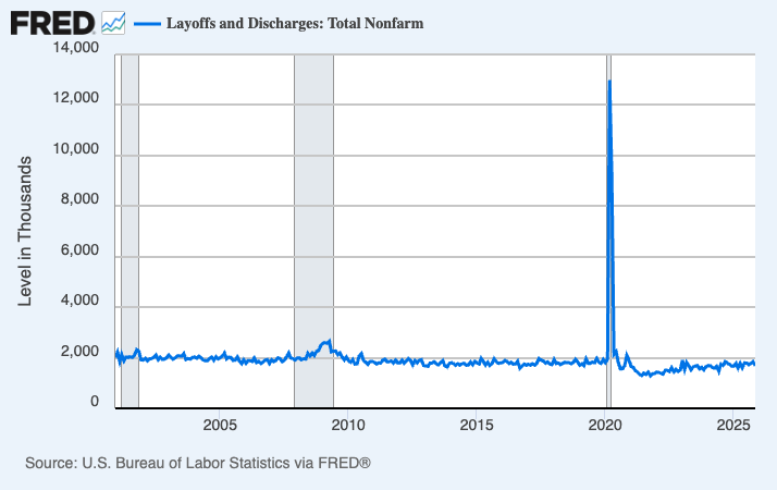 Before we get to that, we first have to remember that layoffs are always happening, even when the economy is booming. According to the most recent monthly Job Openings & Labor Turnover Survey from the BLS, employers laid off 1.7 million people in November.