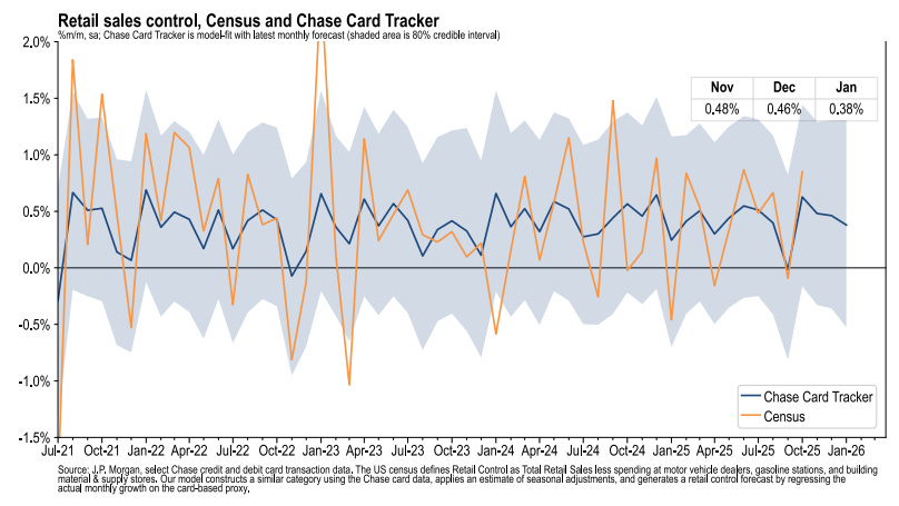 💳 Card spending data is holding up. From JPMorgan: “As of 06 Jan 2026, our Chase Consumer Card spending data (unadjusted) was 4.7% above the same day last year. Based on the Chase Consumer Card data through 06 Jan 2026, our estimate of the US Census November control measure of retail sales m/m is 0.48%.“