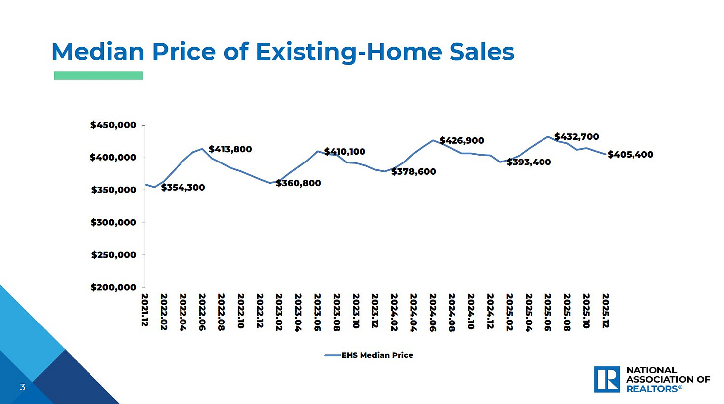 🏘️ Home sales rise. Sales of previously owned homes increased by 5.1% in December to an annualized rate of 4.35 million units. From NAR chief economist Lawrence Yun: “2025 was another tough year for homebuyers, marked by record-high home prices and historically low home sales. However, in the fourth quarter, conditions began improving, with lower mortgage rates and slower home price growth.”