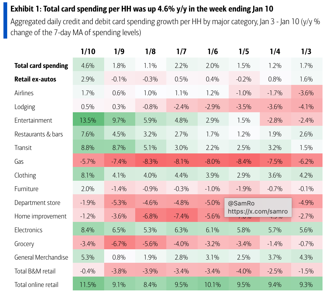 From BofA: “Total card spending per HH was up 4.6% y/y in the week ending Jan 10, according to BAC aggregated credit & debit card data. Entertainment, transit and airlines saw the biggest increase in y/y spending growth since last week. Strong spending growth across most categories is likely partly due to favorable base effects from major snowstorms in Jan’25.”
