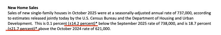 In other words, while new home sales reportedly increased by 0.1% in October, there’s a pretty good chance actual new home sales grew by as much as 14.3% or fell by as much as 14.2% from the previous month. Also, the base number may still be revised upward or downward.