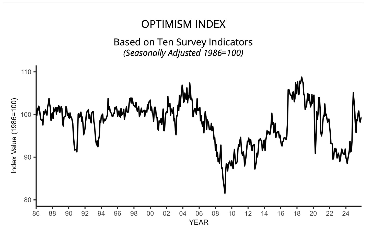 🤷🏻♂️ Small business optimism ticks higher. The NFIB’s Small Business Optimism Index rose to 99.5 in December from 99.0 in November. From the NFIB: “2025 ended with a further increase in small business optimism. While Main Street business owners remain concerned about taxes, they anticipate favorable economic conditions in 2026 due to waning cost pressures, easing labor challenges, and an increase in capital investments.”