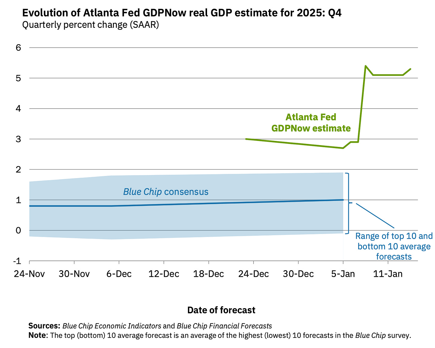 📈 Near-term GDP growth estimates are tracking positively. The Atlanta Fed’s GDPNow model sees real GDP growth rising at a 5.3% rate in Q4.