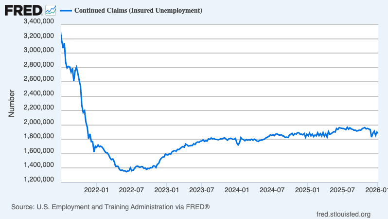 Insured unemployment, which captures those who continue to claim unemployment benefits, declined to 1.884 million during the week ending Jan. 3.