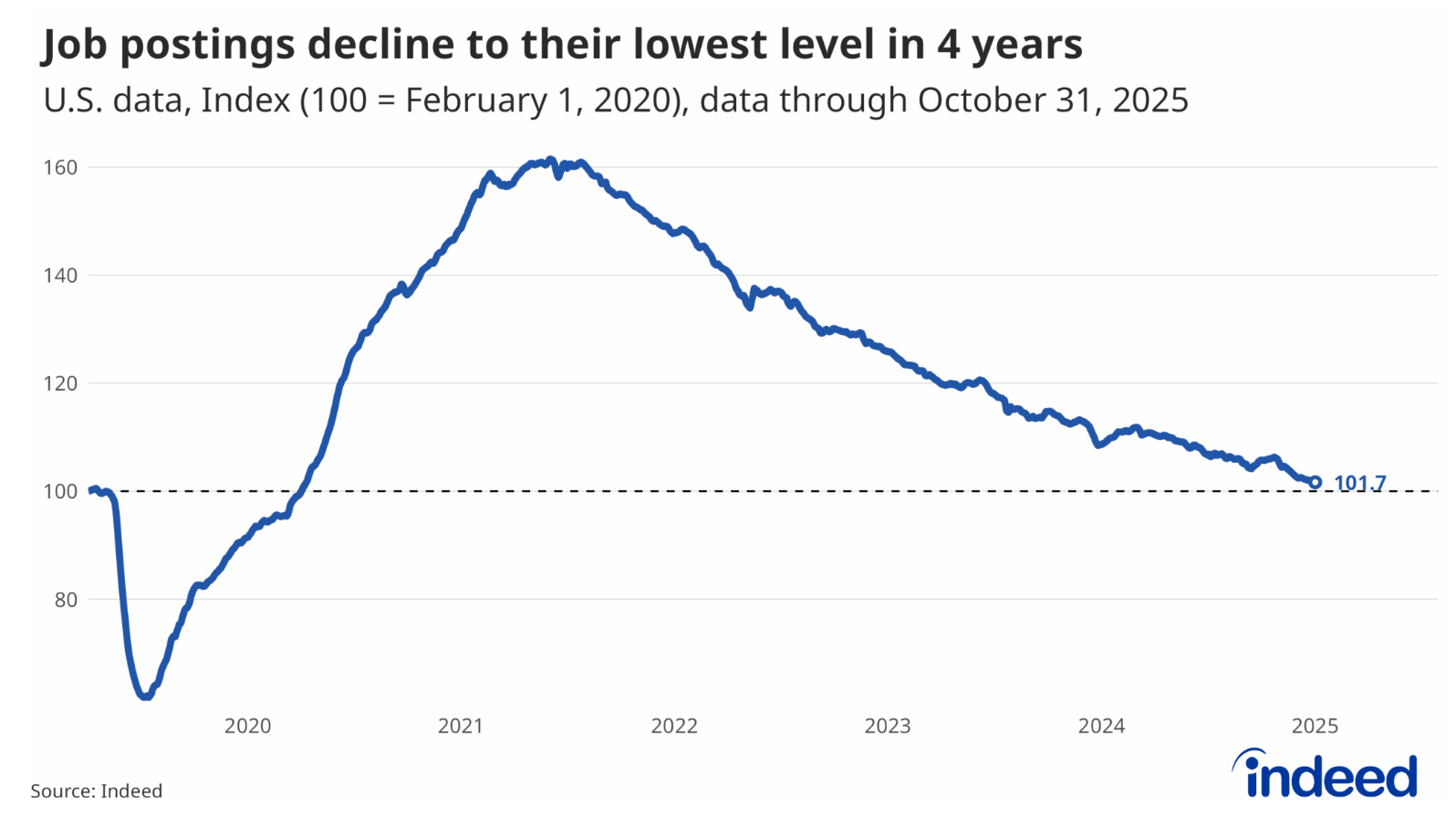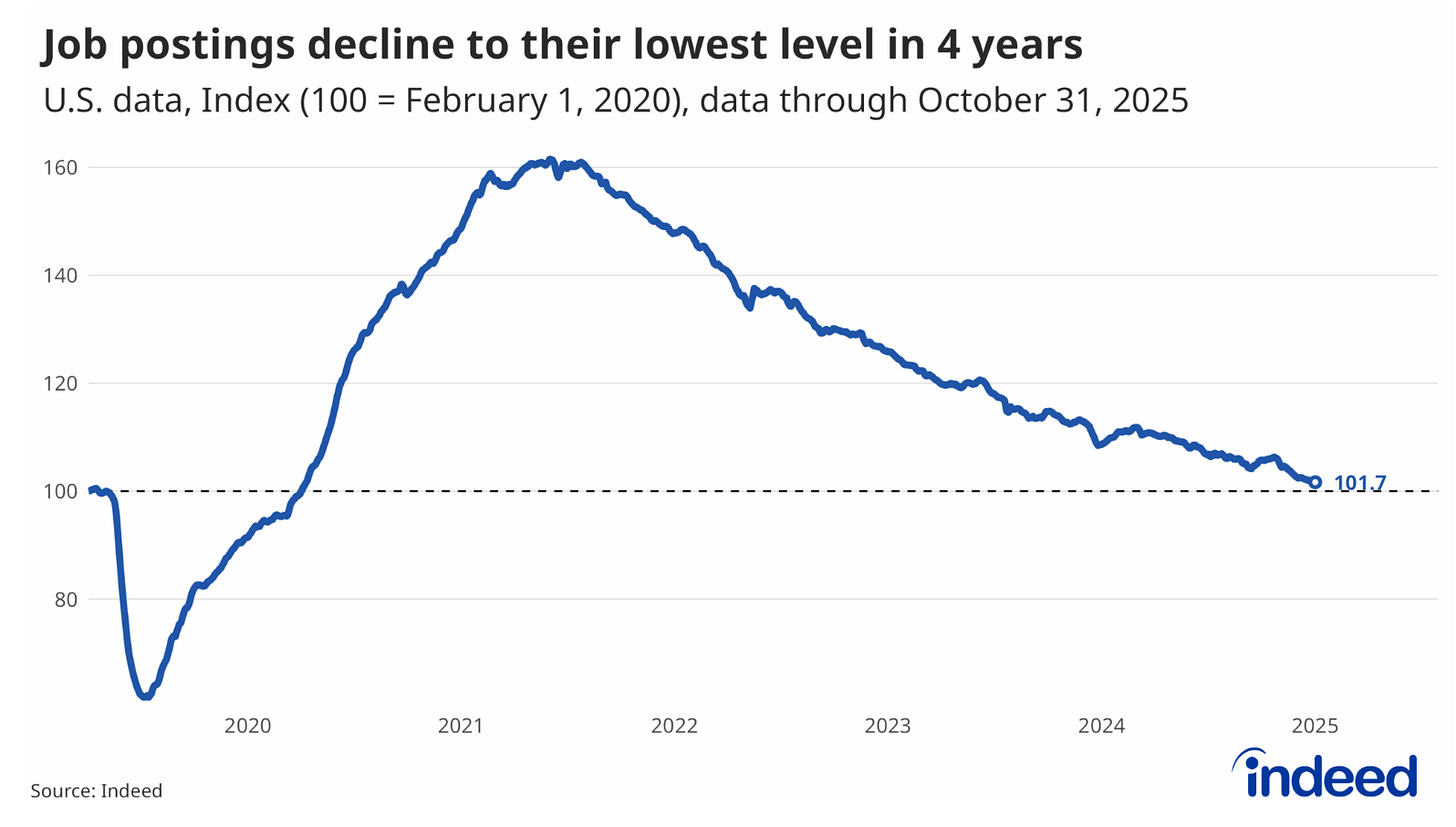 According to job postings site Indeed, “As of October 31, job postings had slumped to their lowest level since 2021, with year-over-year declines recorded in almost every sector tracked by Indeed.”