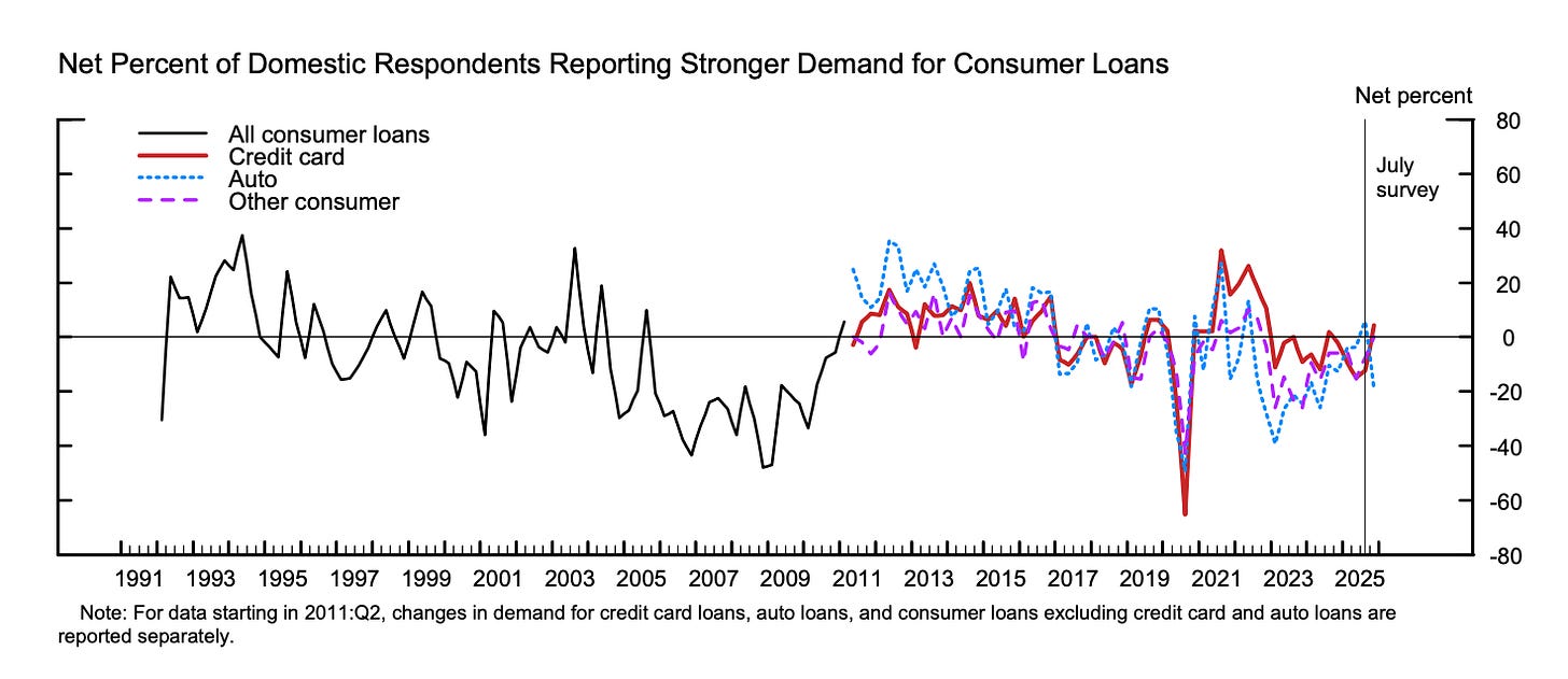 “Meanwhile, demand remained basically unchanged for credit card and other consumer loans and weakened for auto loans.“