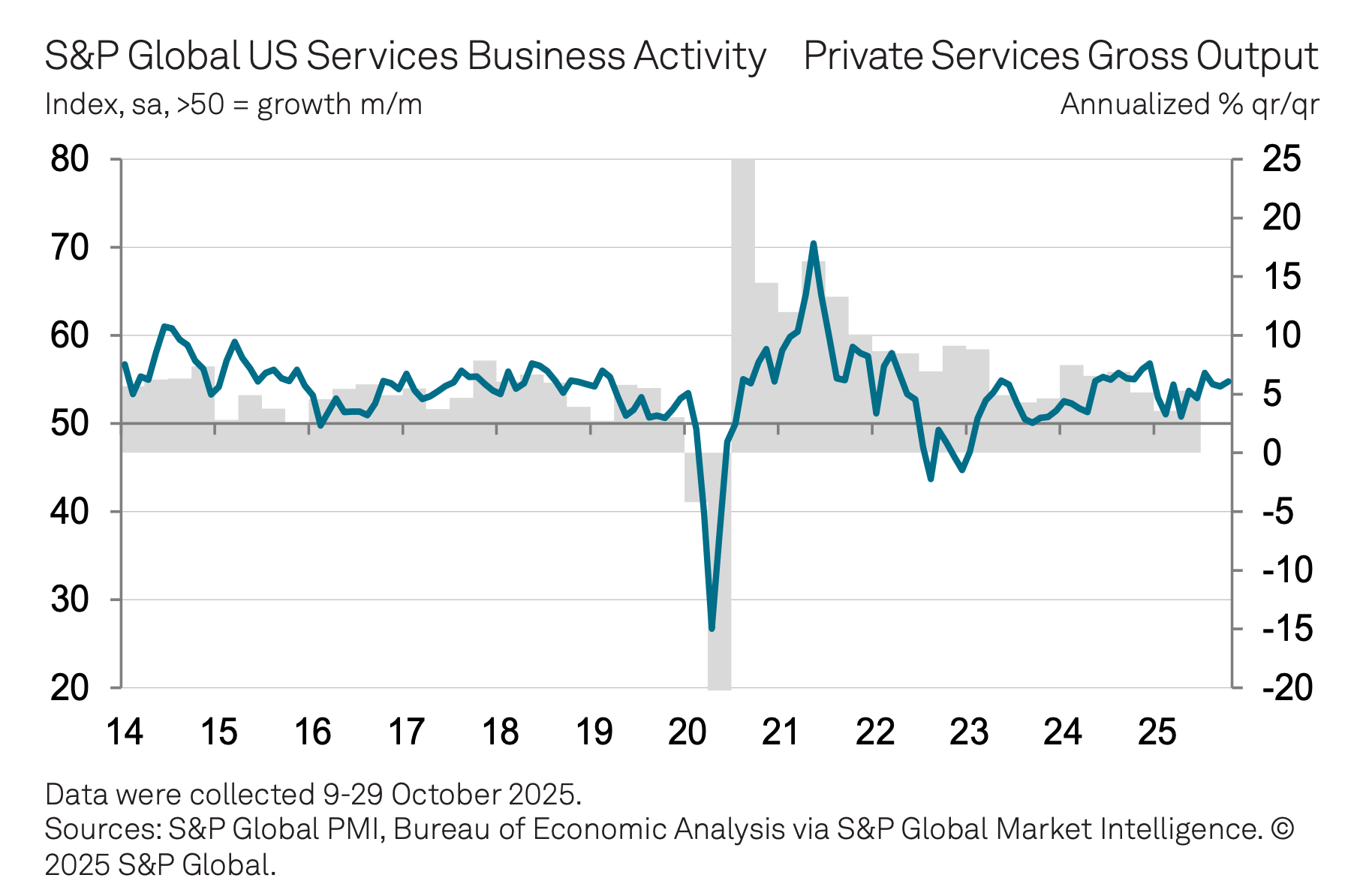 👍 Services activity surveys improve. From S&P Global’s October U.S. Services PMI: “Growth in the vast services economy has picked up speed to accompany an improved performance in the manufacturing sector. In total, business activity is growing at a rate commensurate with GDP rising at an annualized pace of around 2.5% after a similarly solid expansion was signalled for the third quarter. … However, there are signs that new business is coming at the cost of service providers having to soak up continued high input price growth to remain competitive. Customers are often pushing back on price rises, especially in consumer-facing markets. While good news in terms of inflation, this lack of pricing power hints at weak underlying demand and lower profits.”
