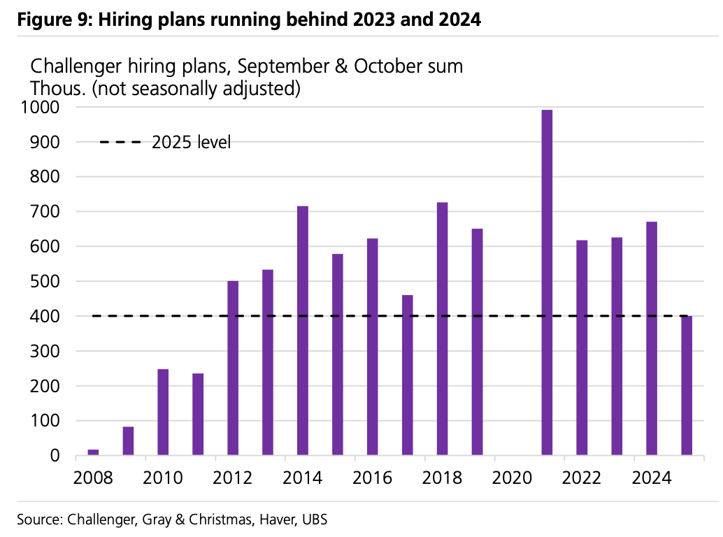 Outplacement firm Challenger, Gray & Christmas, which tracks hiring plans in corporate announcements and public filings, said employers planned to hire 283,138 workers in October. Here’s UBS with some context: “Looking ahead, seasonal hiring does not look very strong this holiday season… The sum of September and October seasonally adjusted total hiring plans is 400K, well below the 625K average in the 2014 to 2019 period, 625K in 2023 and 670K in 2024.”