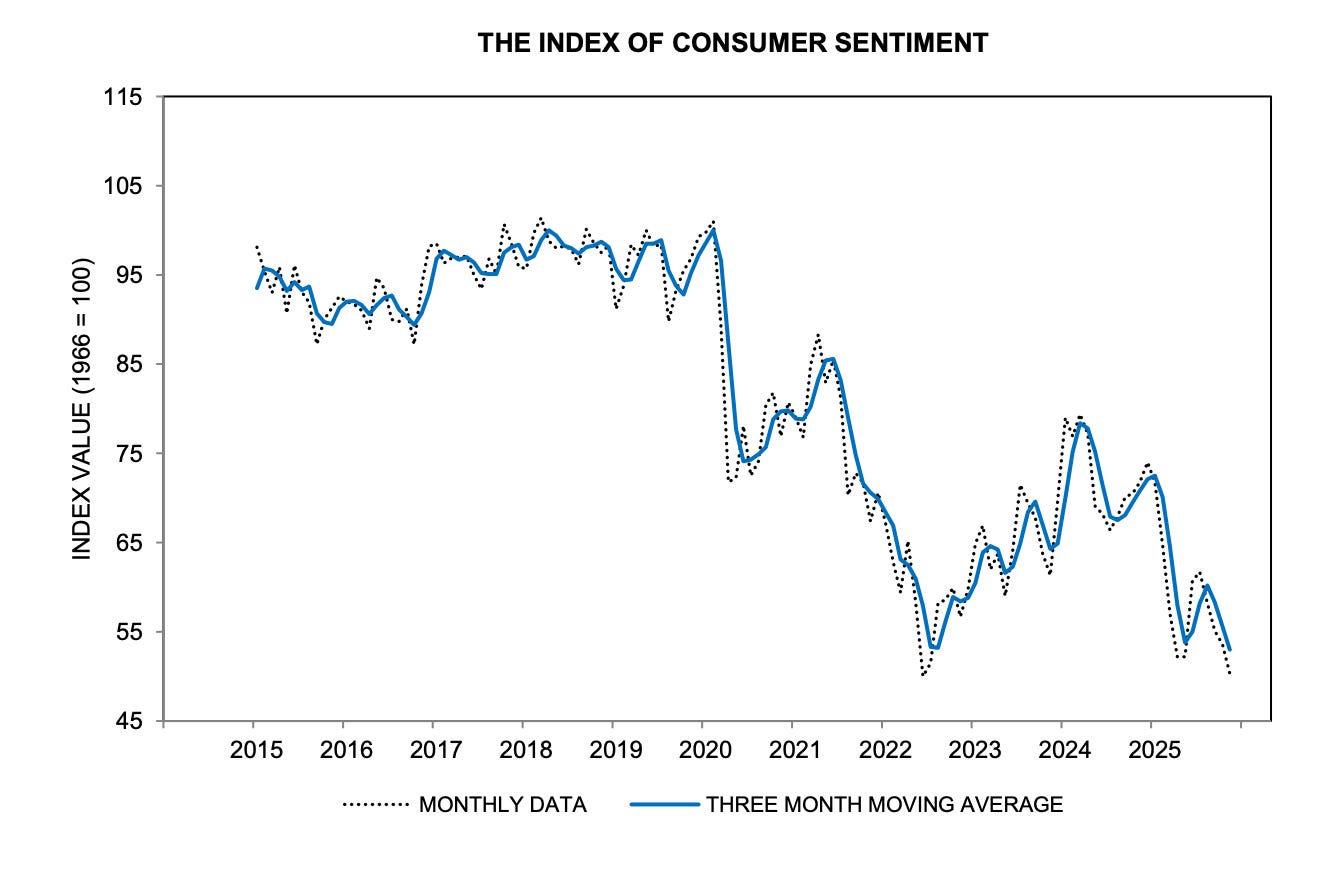 👎 Consumer vibes are in the dumps. From the University of Michigan’s November Surveys of Consumers: “Consumer sentiment fell back about 6% this November, led by a 17% drop in current personal finances and a 11% decline in year-ahead expected business conditions. With the federal government shutdown dragging on for over a month, consumers are now expressing worries about potential negative consequences for the economy. This month’s decline in sentiment was widespread throughout the population, seen across age, income, and political affiliation. One key exception: consumers with the largest tercile of stock holdings posted a notable 11% increase in sentiment, supported by continued strength in stock markets.”