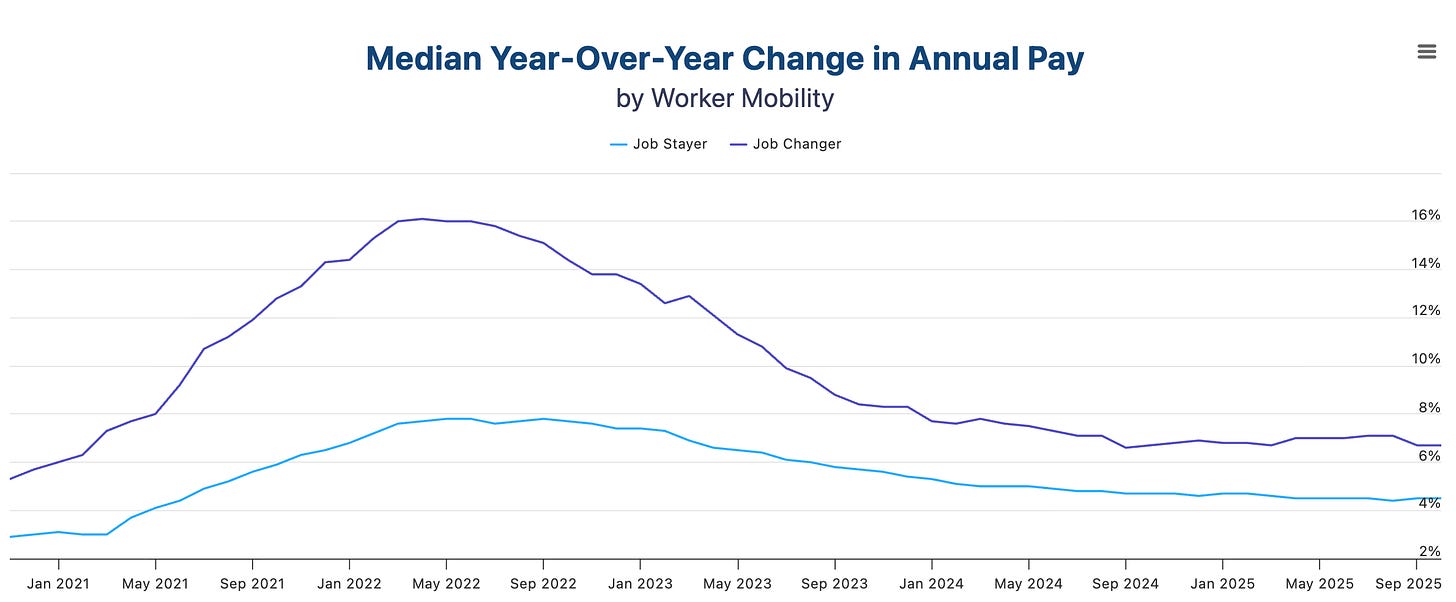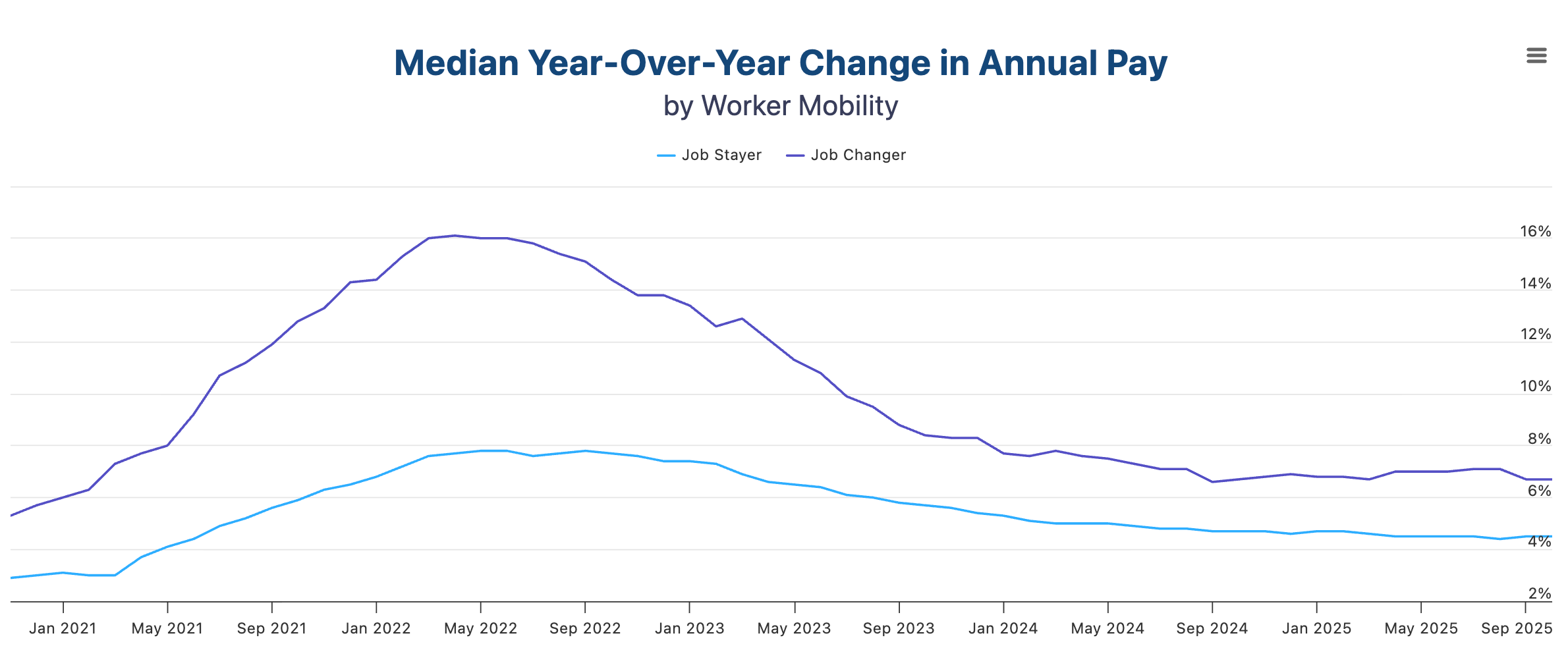Similarly, ADP’s Pay Insights data shows that wage growth for those changing jobs or staying at jobs has plateaued.