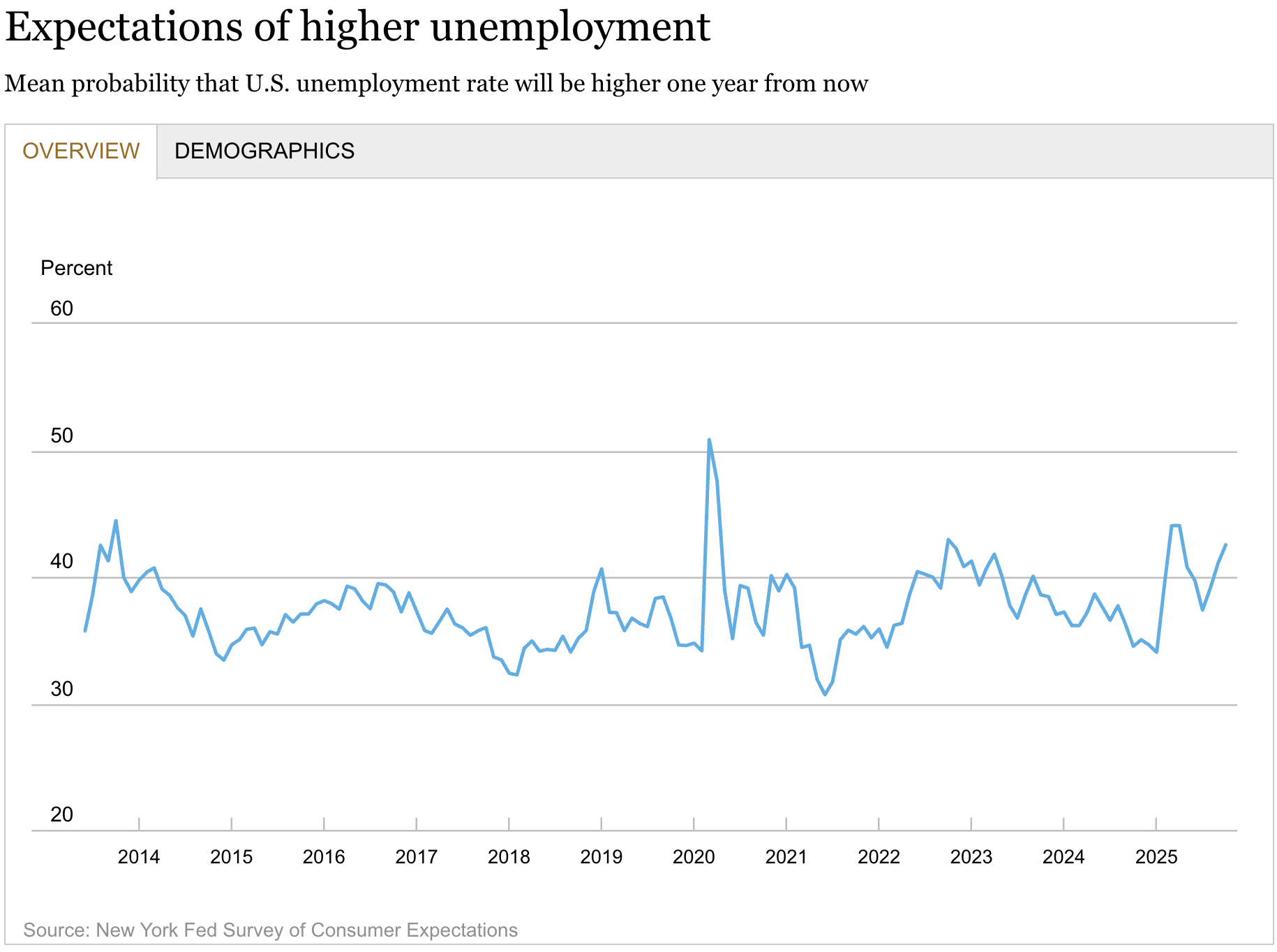 According to the New York Fed’s Survey of Consumer Expectations, a growing percentage of consumers expect the unemployment rate to be higher a year from now.