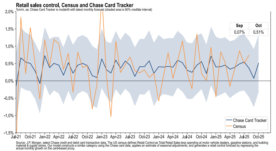 💳 Card spending data is holding up. From JPMorgan: “As of 24 Oct 2025, our Chase Consumer Card spending data (unadjusted) was 1.8% above the same day last year. Based on the Chase Consumer Card data through 24 Oct 2025, our estimate of the US Census September control measure of retail sales m/m is 0.07%.”