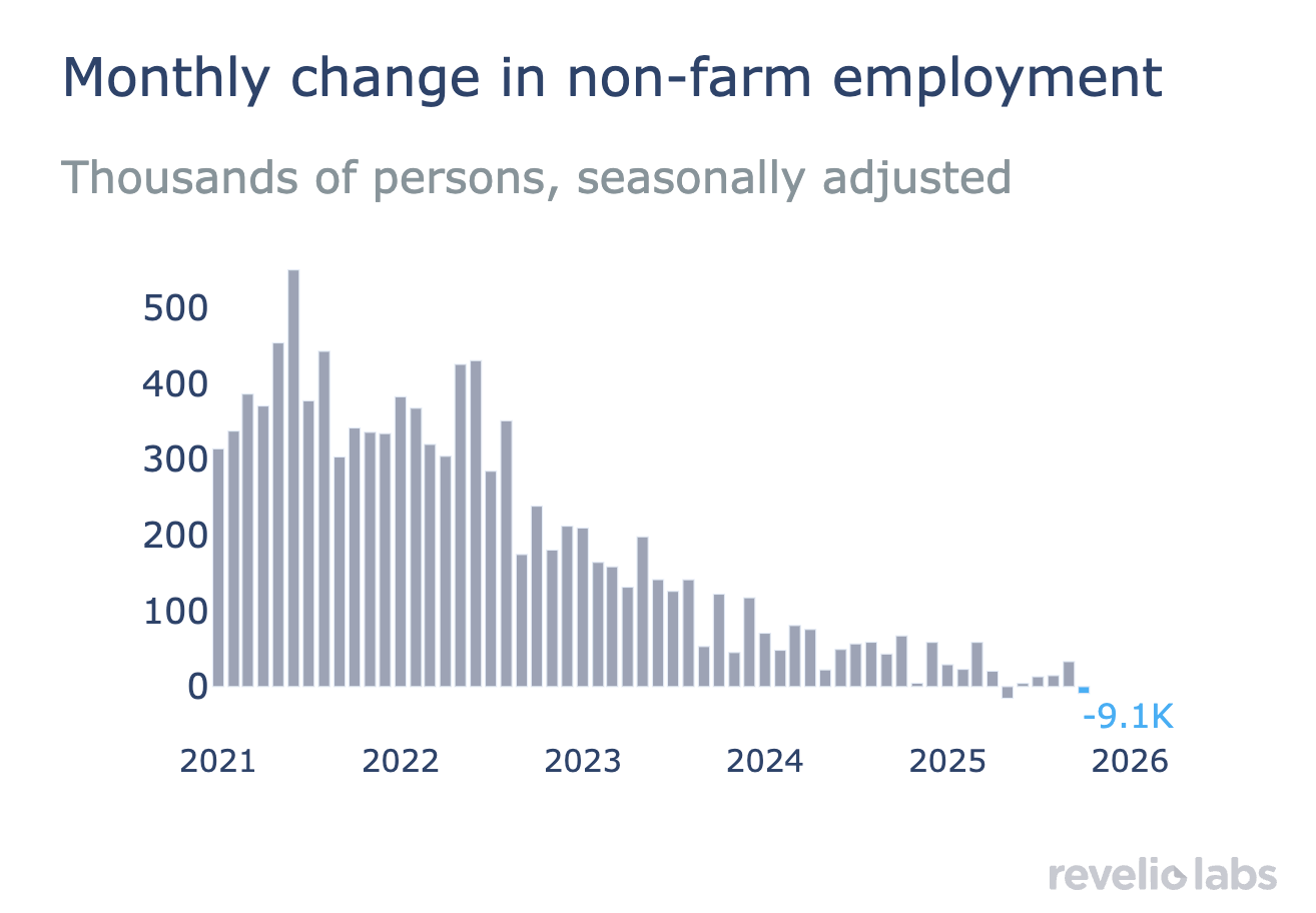 Revelio Labs, which analyzes online professional profiles, estimates nonfarm payroll employment, which includes public and private sector employers, fell by 9,100 jobs in October.