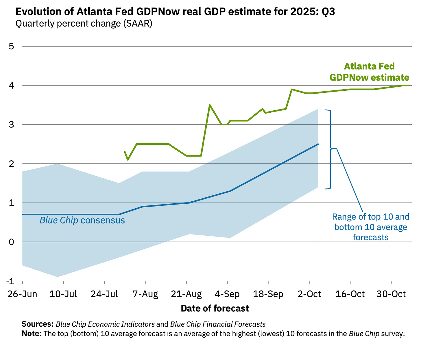 📈 Near-term GDP growth estimates are tracking positively. The Atlanta Fed’s GDPNow model sees real GDP growth rising at a 4.0% rate in Q3.