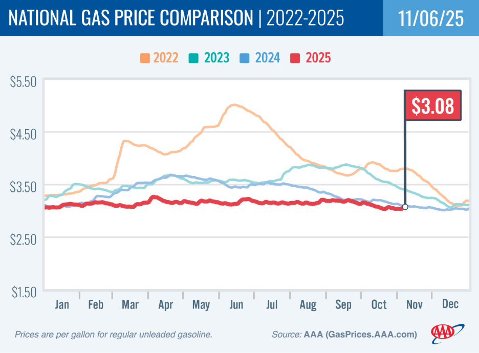 ⛽️ Gas prices tick higher. From AAA: “Gas prices remain relatively stable as November kicks off. The national average for a gallon of regular went up nearly 5 cents since last week to $3.08. Refinery maintenance in California is part of the reason for the increase: when refineries pause production, gas prices in the area temporarily go up. Still, the national average is lower than it was this time last year, and gas prices should remain on a quiet path as we get closer to Thanksgiving.”