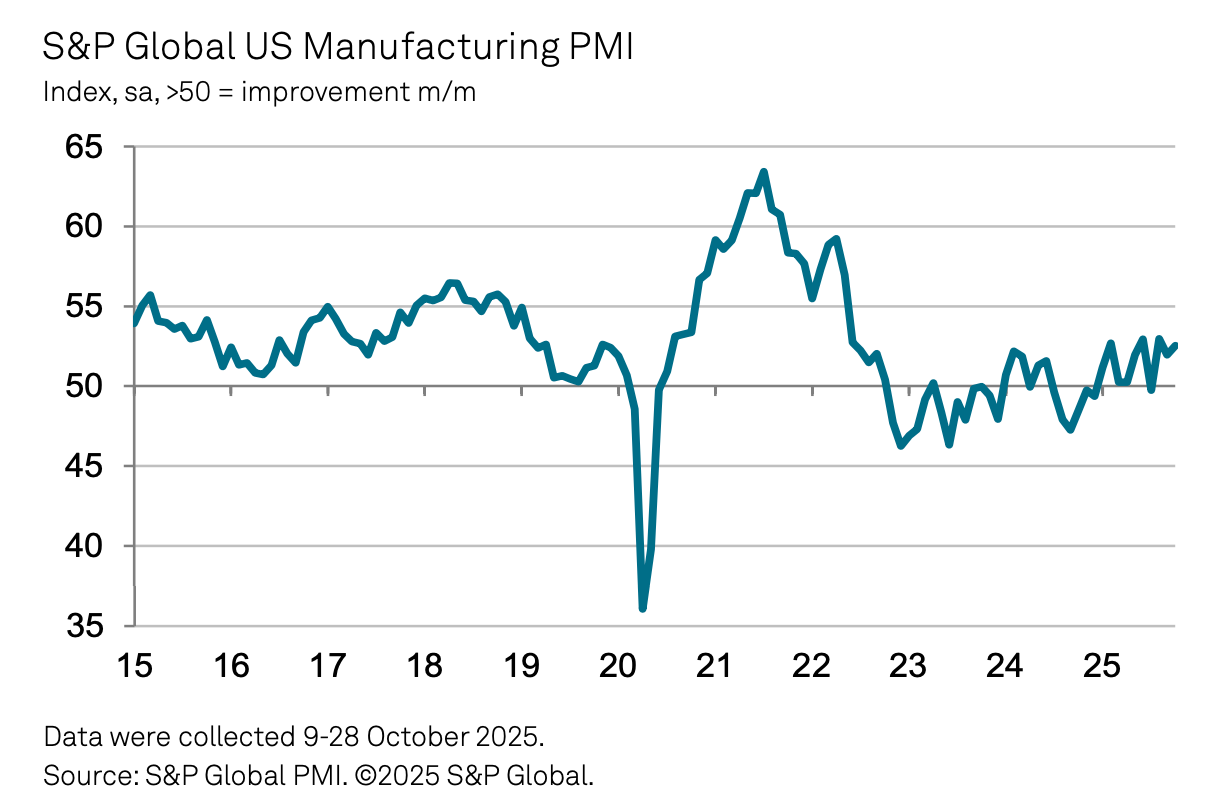 🤷🏻♂️ Manufacturing activity surveys were mixed. From S&P Global’s October U.S. Manufacturing PMI: “US manufacturers reported a solid start to the fourth quarter with production rising at an increased rate in response to an encouragingly robust jump in new orders. However, lift the hood and the picture is not so healthy. Most worrying is the unprecedented rise in unsold stock reported in October, widely linked to weaker than anticipated sales to customers, especially in export markets, which could trigger a downshifting of production in the coming months unless demand revives.”