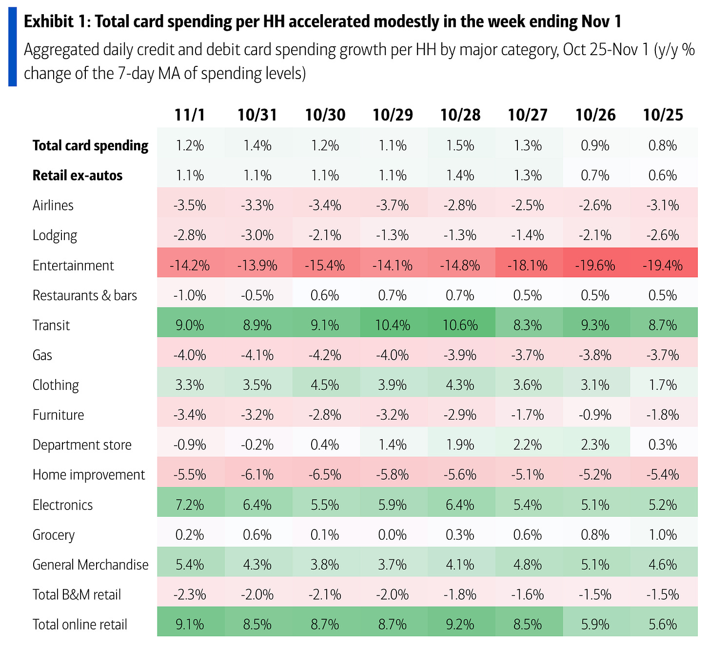 From BofA: “Total card spending per HH was up 1.2% y/y in the week ending Nov 1, according to BAC aggregated credit & debit card data. Y/y entertainment spending growth recovered modestly last week. Clothing, electronics and online retail accelerated. Furniture, restaurants & bars, and department stores saw the biggest drop in y/y spending growth in the week ending Nov 1.“