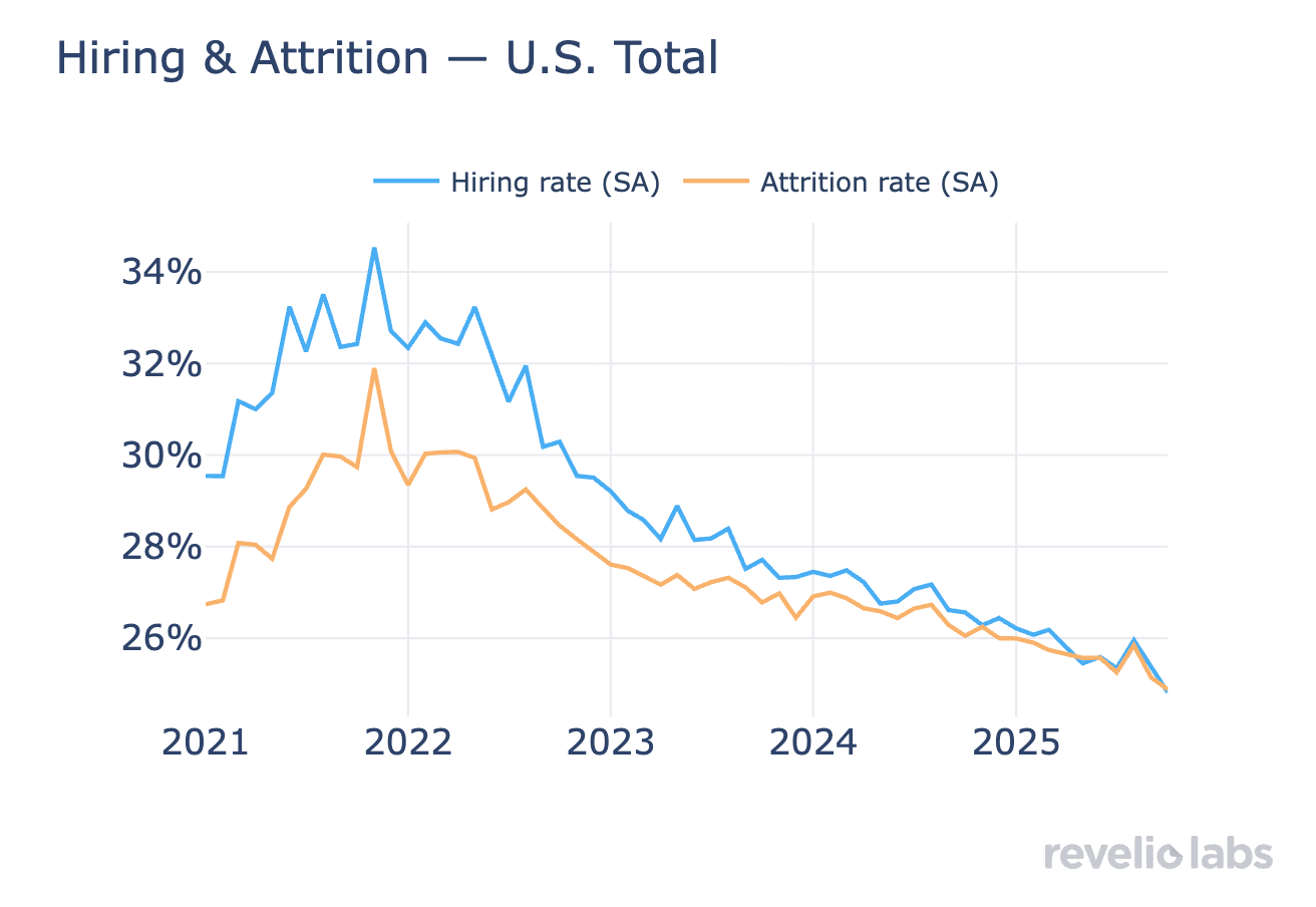 According to Revelio Labs, the hiring rate continued to fall through October, suggesting companies have become less eager to fill open roles or add to staff. Similarly, attrition rates have fallen, suggesting employees are holding tight to their jobs or aren’t finding better opportunities elsewhere.