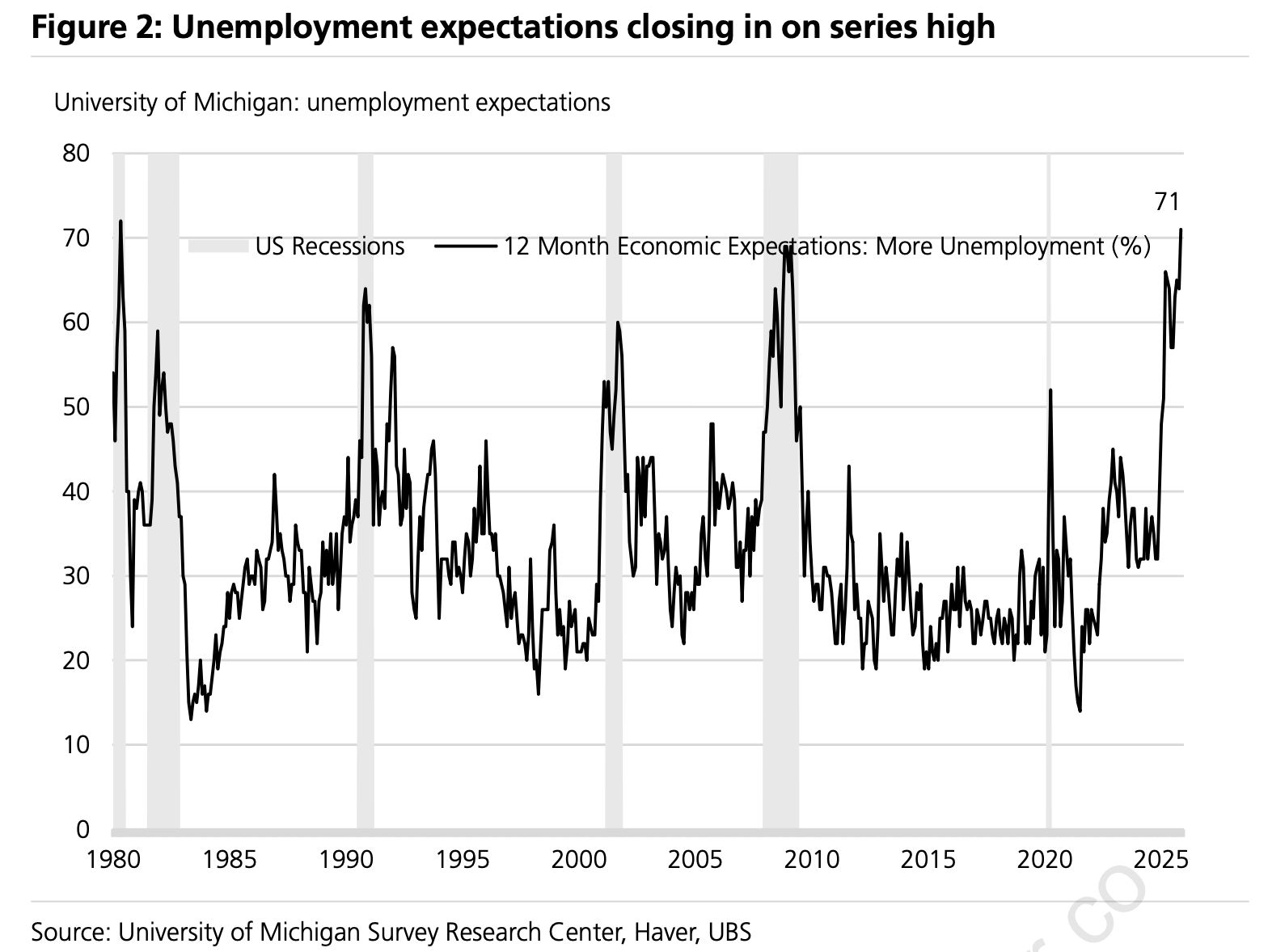 Citing University of Michigan consumer survey data, UBS notes 71% of consumers expect higher unemployment in 12 months.