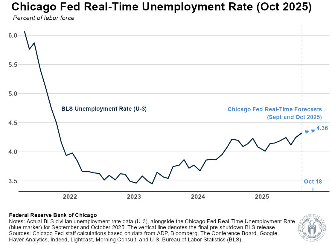 The Chicago Fed has a model that combines a bunch of available data to estimate the unemployment rate. And based on what’s out there, they estimate the unemployment rate was near 4.4% in October, which would be the highest rate in four years.