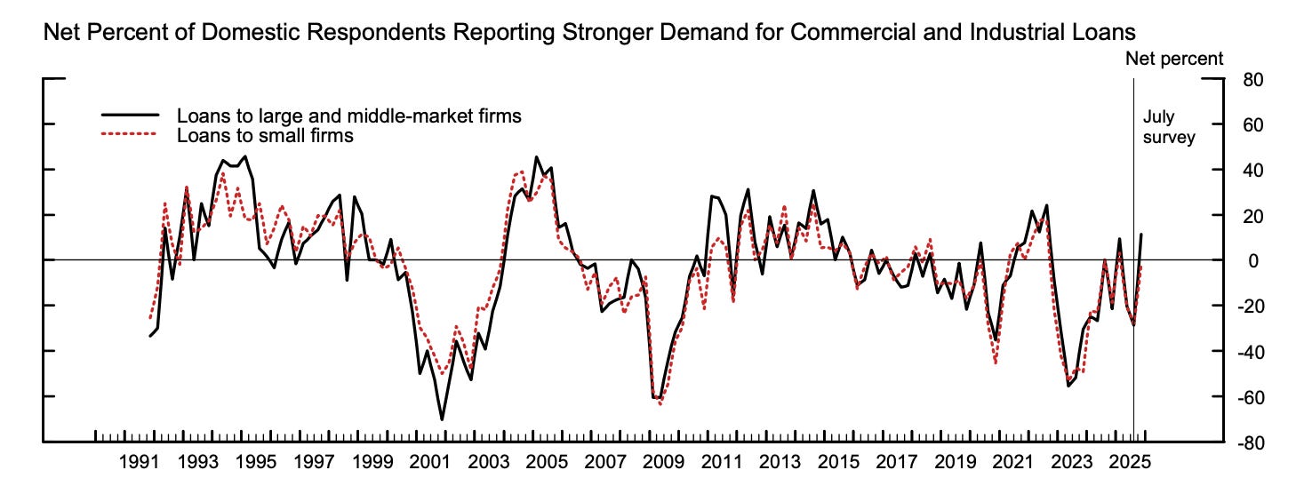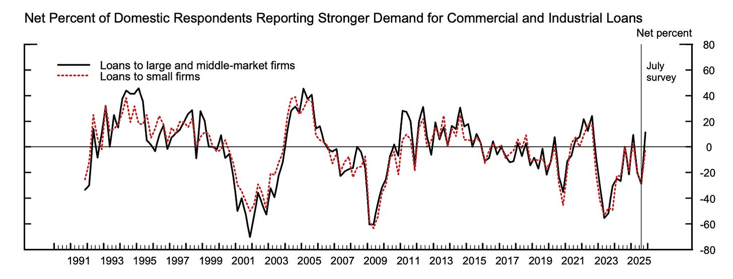 “Banks also reported, on balance, stronger demand for C&I loans from large and middle-market firms and basically unchanged demand from small firms.”