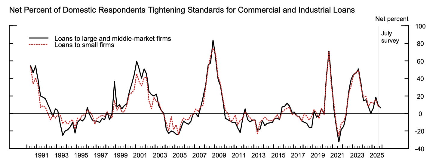 From the Fed: “Regarding loans to businesses over the third quarter, survey respondents reported, on balance, tighter lending standards for commercial and industrial (C&I) loans to firms of all sizes.”
