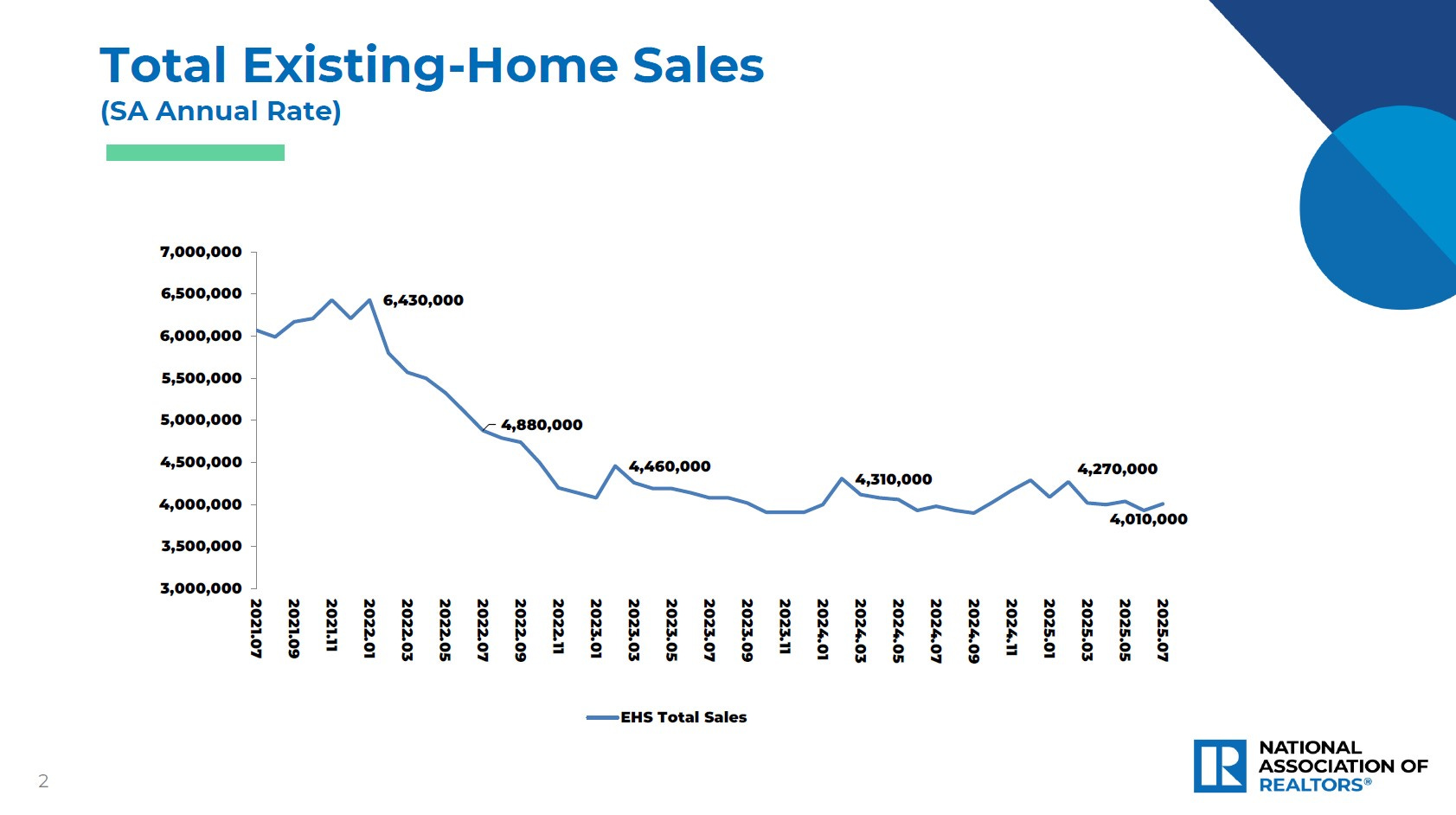 🏘️ Home sales tick higher. Sales of previously owned homes increased by 2.0% in July to an annualized rate of 4.01 million units. From NAR chief economist Lawrence Yun: “The ever-so-slight improvement in housing affordability is inching up home sales. Wage growth is now comfortably outpacing home price growth, and buyers have more choices. Condominium sales increased in the South region, where prices had been falling for the past year.”