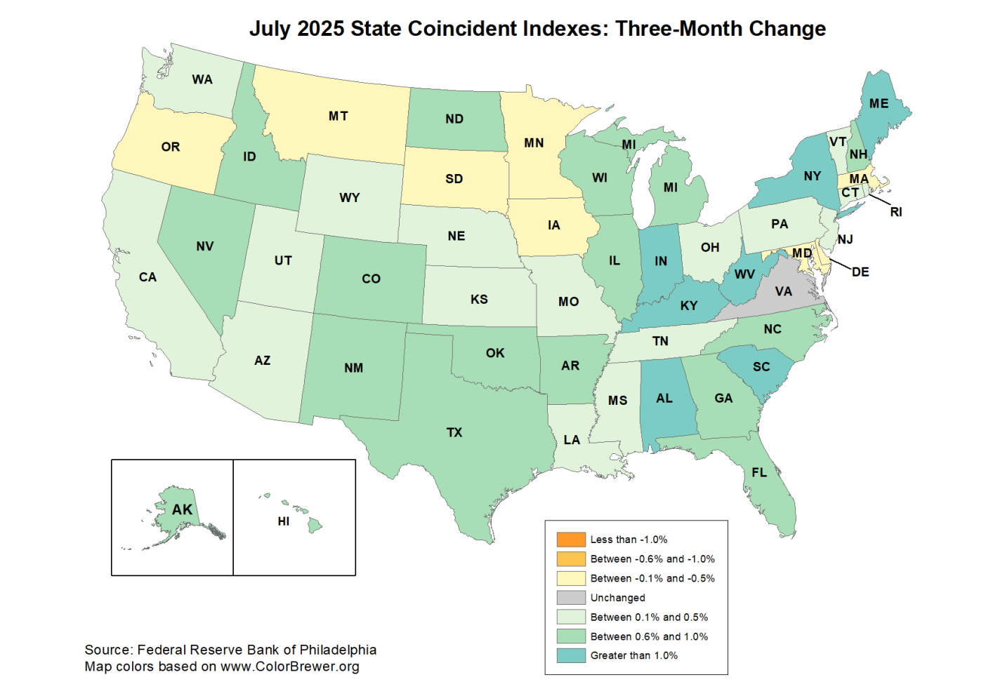 🇺🇸 Most U.S. states are still growing. From the Philly Fed’s July State Coincident Indexes report: “Over the past three months, the indexes increased in 41 states, decreased in eight states, and remained stable in one, for a three-month diffusion index of 66. Additionally, in the past month, the indexes increased in 38 states, decreased in five states, and remained stable in seven, for a one-month diffusion index of 66.”