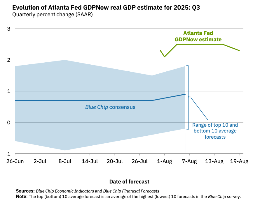 📈 Near-term GDP growth estimates are tracking positively. The Atlanta Fed’s GDPNow model sees real GDP growth rising at a 2.3% rate in Q3.