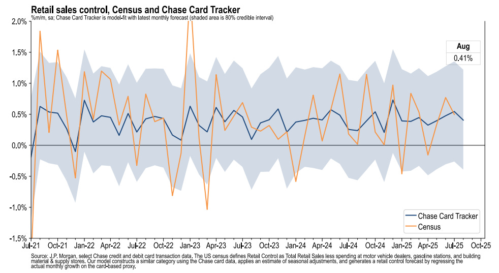 💳 Card spending data is holding up. From JPM: “As of 15 Aug 2025, our Chase Consumer Card spending data (unadjusted) was 4.1% above the same day last year. Based on the Chase Consumer Card data through 15 Aug 2025, our estimate of the US Census August control measure of retail sales m/m is 0.41%.”