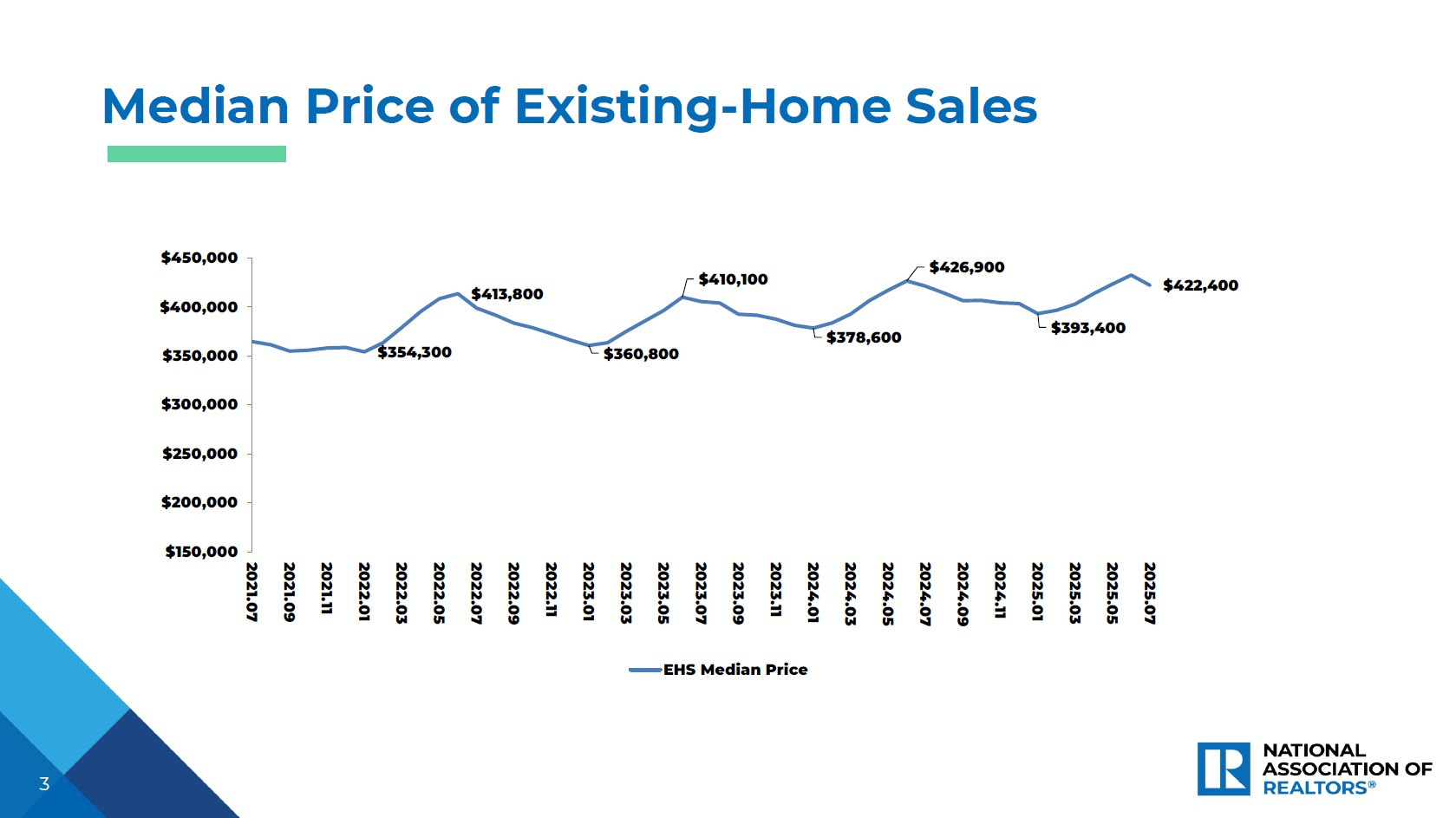 July’s prices for previously owned homes declined month over month, but rose year over year. From the NAR: “The median existing-home sales price for all housing types in July was $422,400, up 0.2% from one year ago ($421,400) – the 25th consecutive month of year-over-year price increases.”