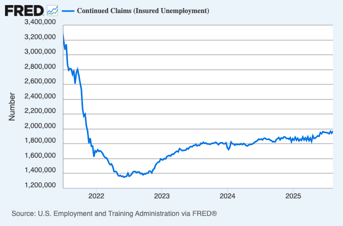 Steady initial claims confirm that layoff activity remains low. Rising continued claims confirm hiring activity is weakening. This dynamic warrants close attention, as it reflects a deteriorating labor market.
