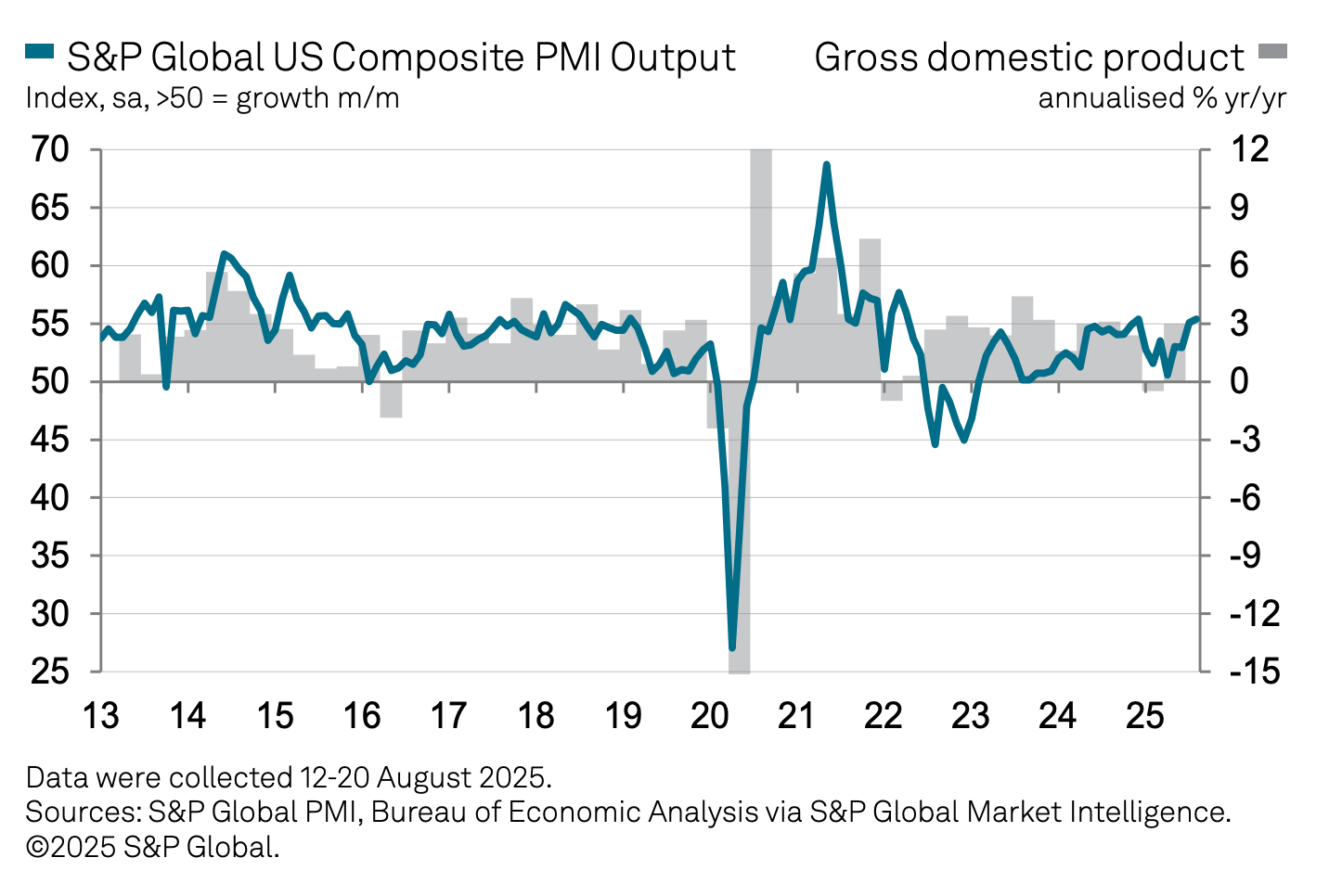 🤷 Activity survey signals economic growth, but also inflation. From S&P Global’s August U.S. PMI: “Companies across both manufacturing and services are reporting stronger demand conditions, but are struggling to meet sales growth, causing backlogs of work to rise at a pace not seen since the pandemic-related capacity constraints recorded in early 2022. Stock building of finished goods has also risen at a survey record pace, linked in part to worries over future supply conditions. While this upturn in demand has fueled a surge in hiring, it has also bolstered firms’ pricing power. Companies have consequently passed tariff-related cost increases through to customers in increasing numbers, indicating that inflation pressures are now at their highest for three years.”