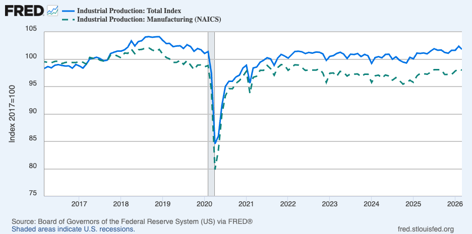 🛠️ Industrial activity ticked lower. Industrial production activity in March fell 0.5% from prior month levels. Manufacturing output declined 0.1% compared to the prior month.