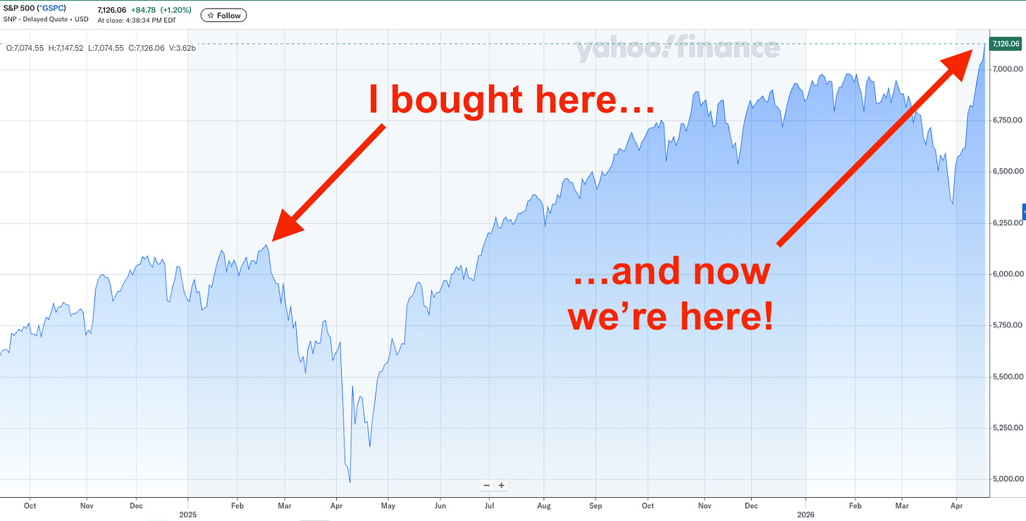 As the stock market set new highs this week, I reflected on this poorly timed, lump-sum purchase I made back on Feb. 18, 2025, when the S&P 500 was at 6,129. That was a day before the market topped and then tumbled 19%. Fortunately, stocks quickly recovered those losses, and I was back to breakeven within a few months. (Read more about that here and here.)
