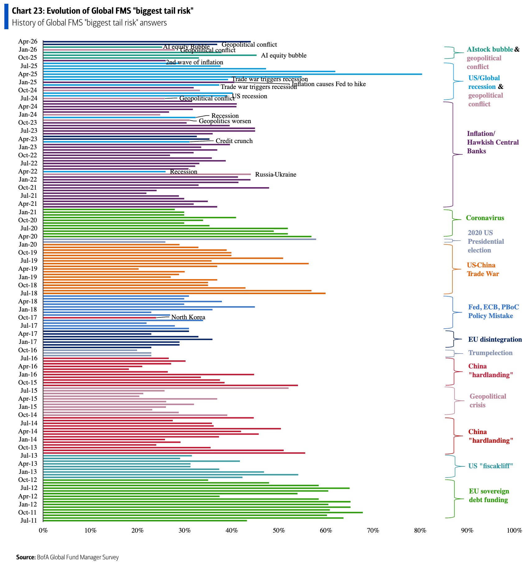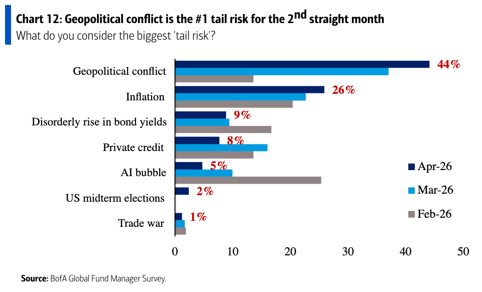 😬 This is the stuff pros are worried about. From BofA’s April Global Fund Manager Survey: “Asked for the biggest 'tail risk', 44% of FMS investors said ‘geopolitical conflict,’ up sharply from 14% in February (37% last month).”