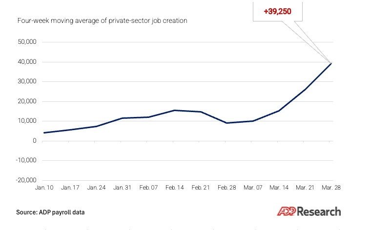 🤔 Recent private job growth has picked up. According to payroll processor ADP, private U.S. employers added 39,250 jobs in the four weeks ending March 28.