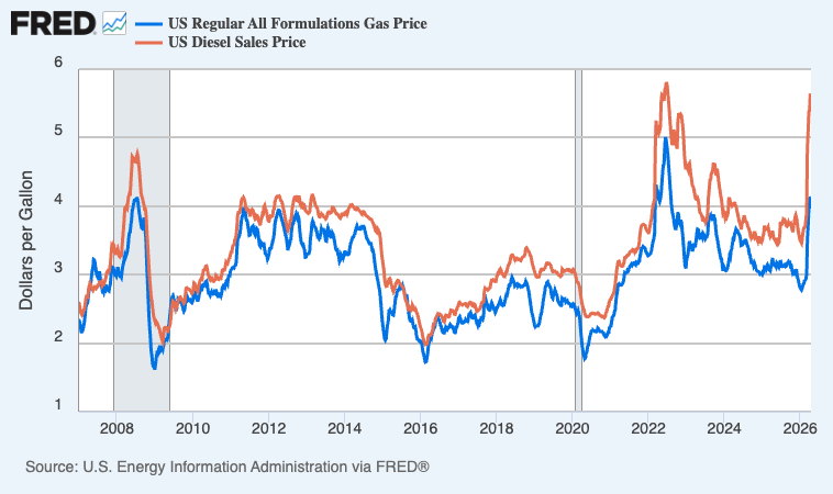 ⛽️ Gas and diesel prices remain elevated. From AAA: “The national average for a gallon of regular gasoline decreased 7 cents over the past week to $4.09. After last week’s announcement of a two-week ceasefire between the U.S. and Iran, the price for a barrel of crude oil has continued to trade below $100. However, maritime traffic transiting the Strait of Hormuz remains subdued as regional tensions persist and negotiations continue.”