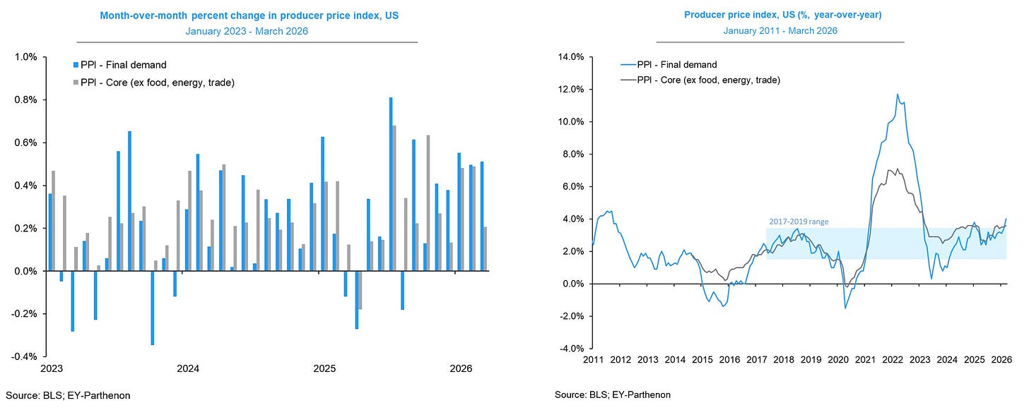 🎈 Wholesaler price inflation was hotter. The Producer Price Index (PPI) in March jumped 0.5% month over month, driven by higher energy prices. Adjusted for food and energy prices, core PPI was up 0.2%. On a year-over-year basis, PPI was 4.0% and core PPI was up 3.6%.