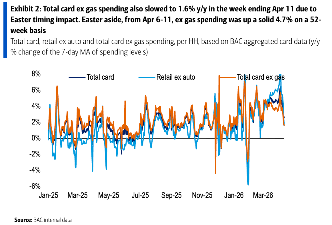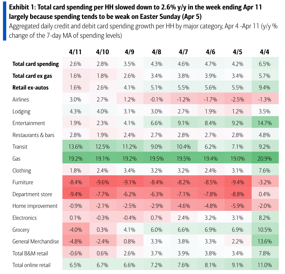 💳 Card spending data is holding up. From BofA: “Total card spending per HH was up 2.6% y/y in the week ending Apr 11, according to BAC aggregated credit & debit card data. This slowdown in the week ending Apr 11 was largely because spending tends to be weak on Easter Sunday (Apr 5). Easter aside, from Apr 6-11, total card & total ex gas spending were up a solid 5.6% & 4.7%, respectively on a 52 week basis.“