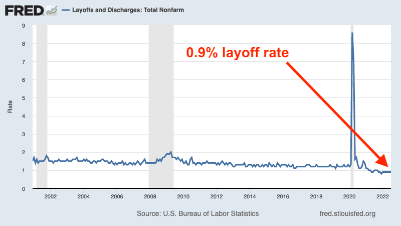 According to Bureau of Labor Statistics (BLS) data released Tuesday, the layoff rate (i.e., layoffs as a percentage of total employment) stood at 0.9% in July, unchanged from its June level.1 It was the 17th straight month the rate was below its pre-pandemic lows.