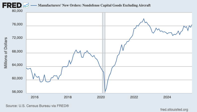 🏭 Business investment activity improves. Orders for nondefense capital goods excluding aircraft — a.k.a. core capex or business investment — increased 1.1% to $76.4 billion in July.