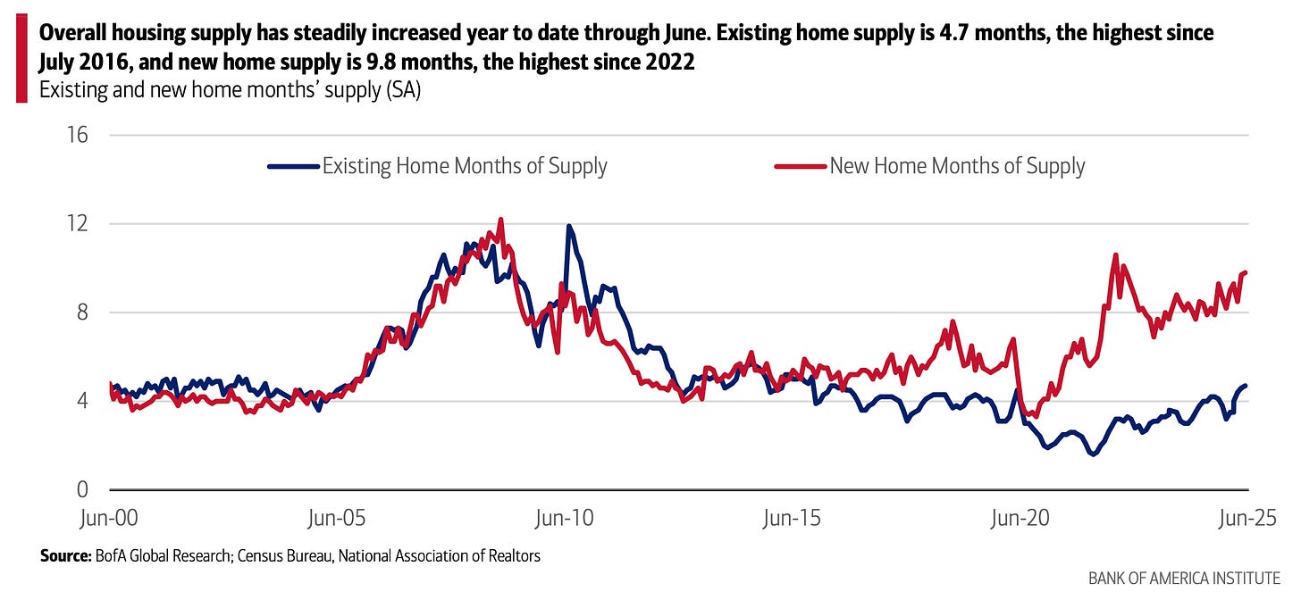🏘️ Housing supply is rising. From BofA: “New housing demand remains sluggish, with lack of buyer urgency, job instability, and affordability challenges all cited by builders, according to BofA Global Research. Meanwhile, housing inventory is rising, and new home inventory hit its highest levels since 2007. This is also resulting in downward pressure on the prices of new homes relative to existing homes – the median new home price is now lower than the median existing home price. In turn, builders are pulling back on new home starts in many markets according to BofA Global Research, though some regions like the Midwest are holding up better than others.“