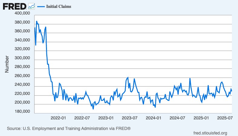 💼 New unemployment claims tick lower, total ongoing claims remain elevated. Initial claims for unemployment benefits declined to 229,000 during the week ending Aug. 23, down from 234,000 the week prior. This metric remains at levels historically associated with economic growth.