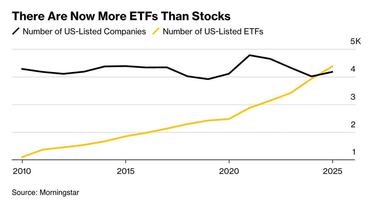 And according to Morningstar data (first reported by Bloomberg), there are now more ETFs listed on U.S. exchanges than there are individual stocks.