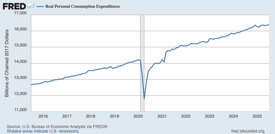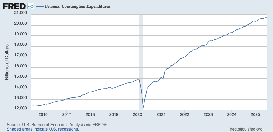 🛍️ Consumer spending ticks higher. According to BEA data, personal consumption expenditures increased 0.5% month-over-month in July to a record annual rate of $20.80 trillion.