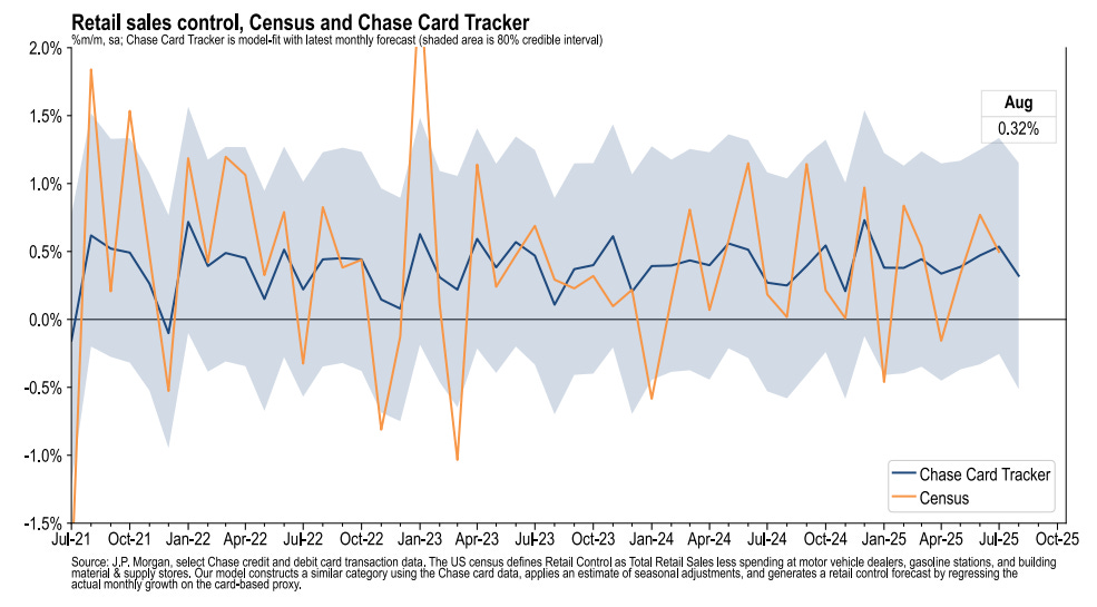 💳 Card spending data is holding up. From JPMorgan: “As of 22 Aug 2025, our Chase Consumer Card spending data (unadjusted) was 2.9% above the same day last year. Based on the Chase Consumer Card data through 22 Aug 2025, our estimate of the US Census August control measure of retail sales m/m is 0.32%.”