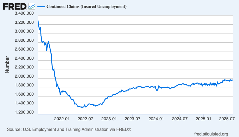 Insured unemployment, which captures those who continue to claim unemployment benefits, declined to 1.954 million during the week ending Aug. 16. This metric is near its highest level since November 2021.