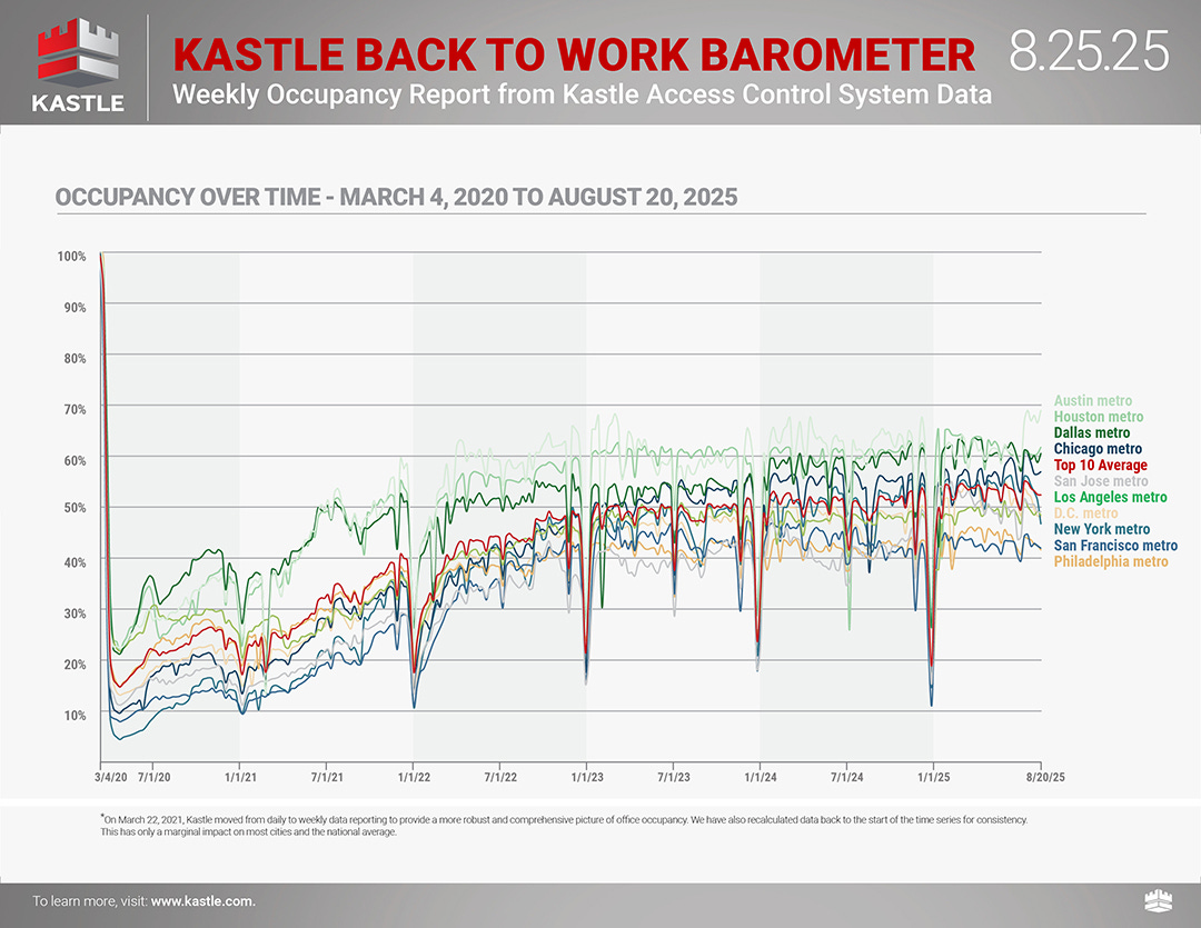 🏢 Offices remain relatively empty. From Kastle Systems: “Peak day office occupancy was 62.1% on Tuesday last week, up four tenths of a point from the previous week. Occupancy fell every day of the week in New York City, with a high on Tuesday of only 57.1%, down six full points from the prior week. In contrast, Austin reached a high of 80.4% on Tuesday, up 5.5 points from the week prior. The average low was 34% on Friday, up three tenths of a point from the previous week.”