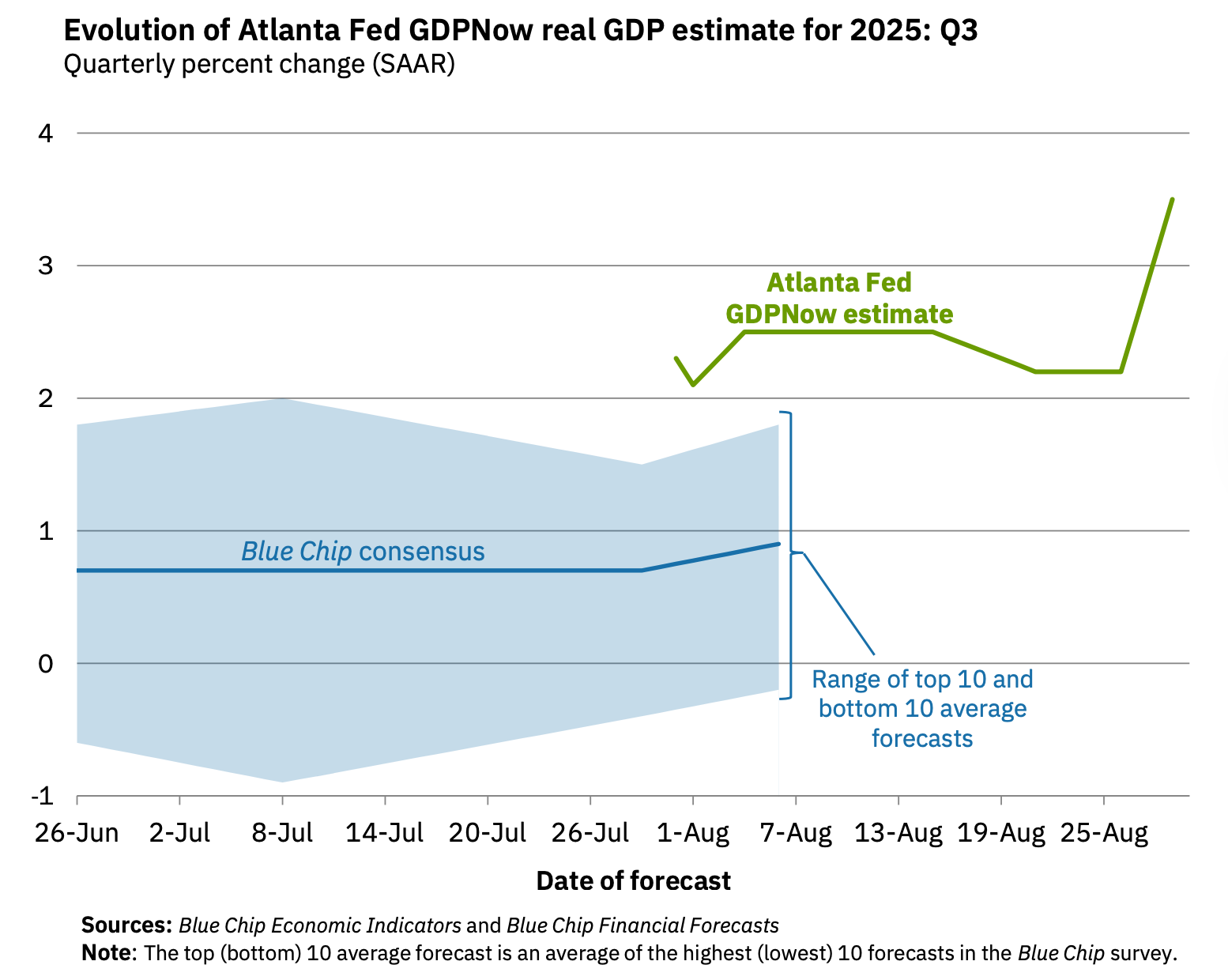 📈 Near-term GDP growth estimates are tracking positively. The Atlanta Fed’s GDPNow model sees real GDP growth rising at a 3.5% rate in Q3.